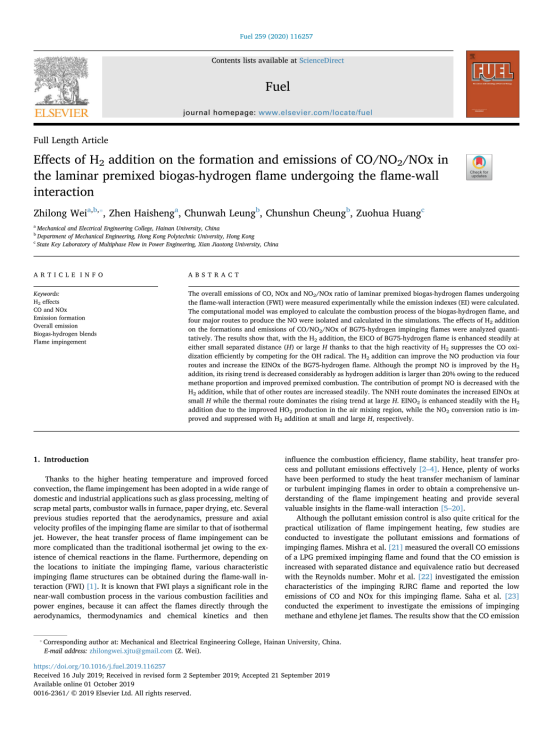 研究团队目前针对生物质气-氢气可再生能源的清洁高效利用,开展了广泛的基础应用研究,促进了对该可再生能源基础特性的认识和理解,为该可再生能源的清洁高效利用提供了多方面的理论支持。该研究得到了香港RGC项目(B-Q39F)和pa电子官方网站科研启动经费(KYQD(ZR)-1905)资助。