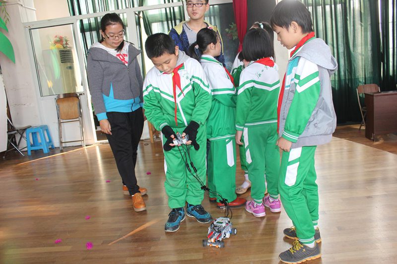 活动开始,由主持人施艺向小学生们讲述本次活动的基本要求,并宣布本次活动正式开始; 随后,在景山分校老师的协助下,将学生分为10组,每组由5名同学组成,在主持人的引领下,有序地在主题条幅上签字;然后,科技梦想服务团成员每人带领一小组同学们,为同学们讲解机器人相关知识及操作过程中的注意事项,并指导同学们自行进行机器人的简单组装。所有的小学生们都非常认真的学习,并投入到动手实践中,直到自己亲手组合成功。