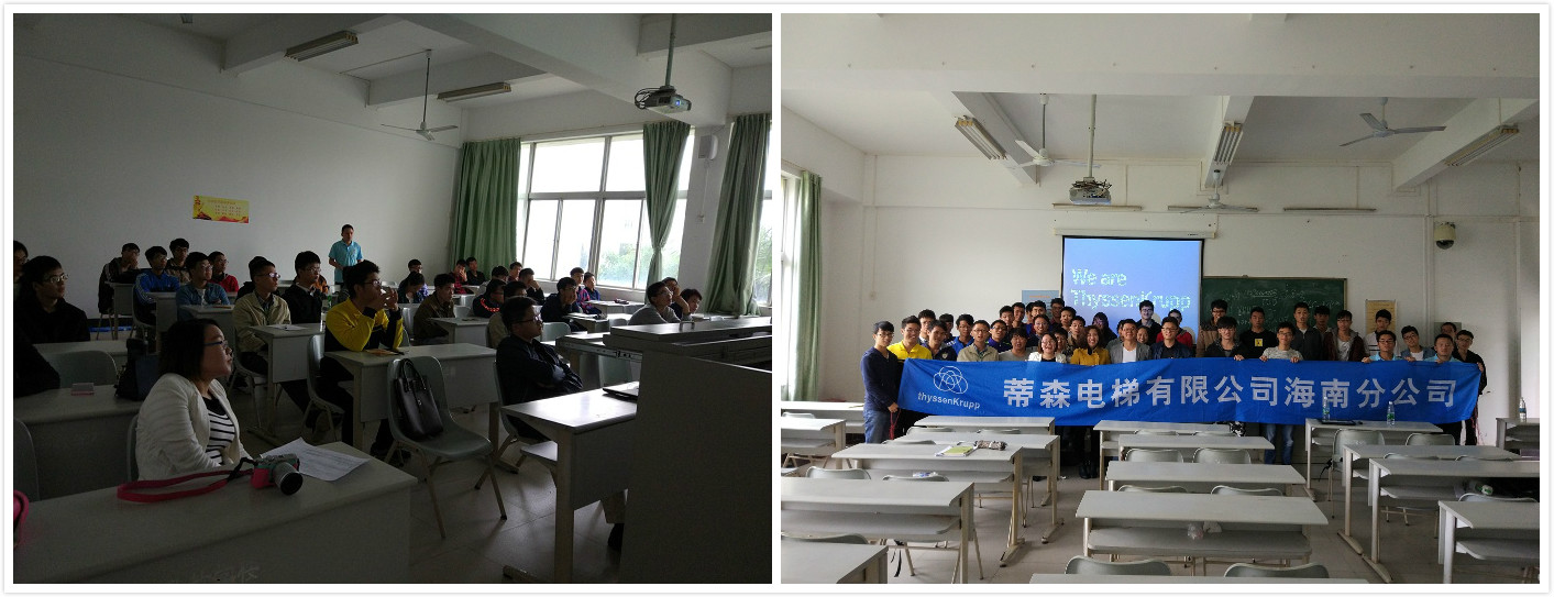 会议开始,崔建兵老师充分肯定了此次活动,希望同学们能以培训为契机把理论知识与实践联系起来,扩充自身知识面,为职业发展打下良好的基础。接着,蒂森克虏伯集团海口分公司何主管介绍了蒂森克虏伯集团的悠久历史,发展方向、公司现状、管培生项目等各方面。然后,三亚分公司售后主管王金路从电梯原理和安全技术两方面为大家培训。培训中,学子专心致志,积极发言,整个教室洋溢着活跃的气氛。