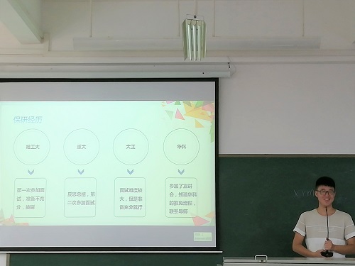 分享会在主持人幽默风趣的开场白中开始了,许日明师兄讲述了参加清华大学和北京理工大学夏令营面试的经历,毫无保留地将自己在清华大学所闻所见的先进科研项目分享给同学们。他认为,提前做好保研准备和努力学习是保研成功必不可少的因素之一。李梓豪就个人简历、保研准备、保研经历三方面进行分享,他表示是否注重细节是衡量个人能否成功的重要因素之一。他通过自己略显坎坷曲折的夏令营经历告诉同学们,保研从来都不是一件简单的事,我们能做的只有“尽人事而听天命”。此外,他还贴心地为同学们推荐了实用的网站和APP方便同学们准备资料。时强胜师兄重点讲解了参加比赛和发表论文的流程以及注意事项。他这样总结自己的保研之路:从最初的茫然不知所措到后来的四处碰壁,再由做足准备全面爆发到最后的永不放弃得以成功,并以“尽吾志已而不能至者,可以无悔矣”和同学们共勉。正是这样,机会总是留给有准备的人,而好运也终将光顾奋进者。