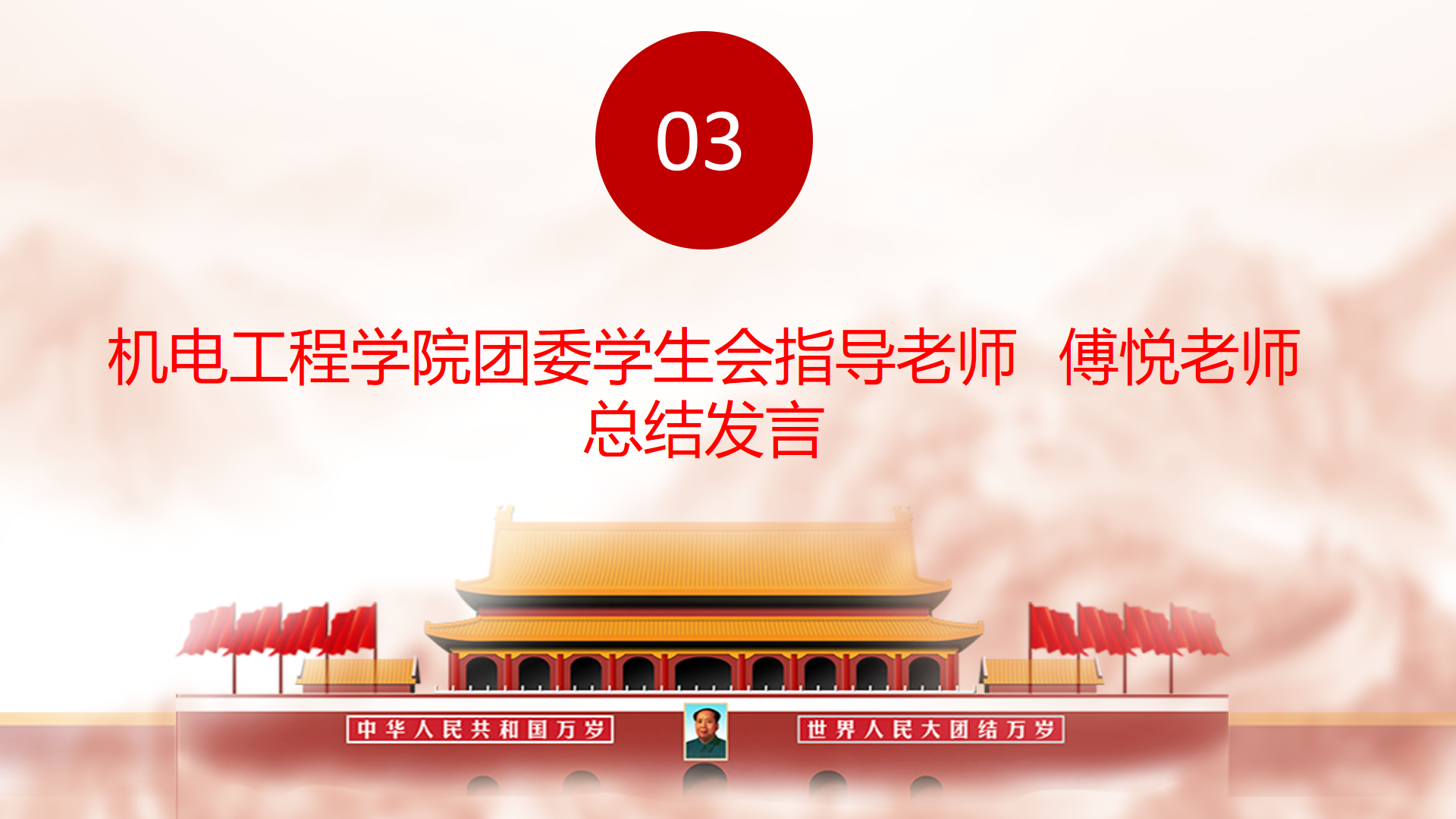 活动的最后,机电团委学生会的指导老师傅悦老师做了总结讲话。她表以抗日战争、朝鲜战争中为国捐躯的青年,以及上世纪60年代在戈壁滩为祖国研究两弹一星的党员青年为例,希望当代青年能够学习榜样的力量,能够在国家需要的时候站出来,成为国家的脊梁。她希望我们机电的学子们能够了解这个世界,认识中国所处的位置,在中华民族艰苦奋斗过程体会中华民族的伟大与美好。最后,傅悦老师祝愿pa电子官方网站的学生们五四青年节快乐,并表达了希望我们向上想好,为中华民族伟大复兴的中国梦而努力奋斗。