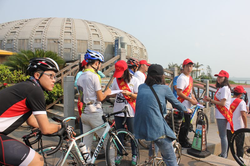 早上8:00志愿者们在海胆剧场集合,分配任务,随后各自按分配的任务进入工作地点,为骑手们服务。在整个过程中,都可以看到我们的志愿者头戴统一的小红帽引导骑行者们按照规定的方式参与此次的骑行活动。现场我们志愿者还协助人体彩绘师,让骑手们自愿往手臂及脸部涂画健康油彩,增添了时尚动感的氛围,是活动的一大亮点。