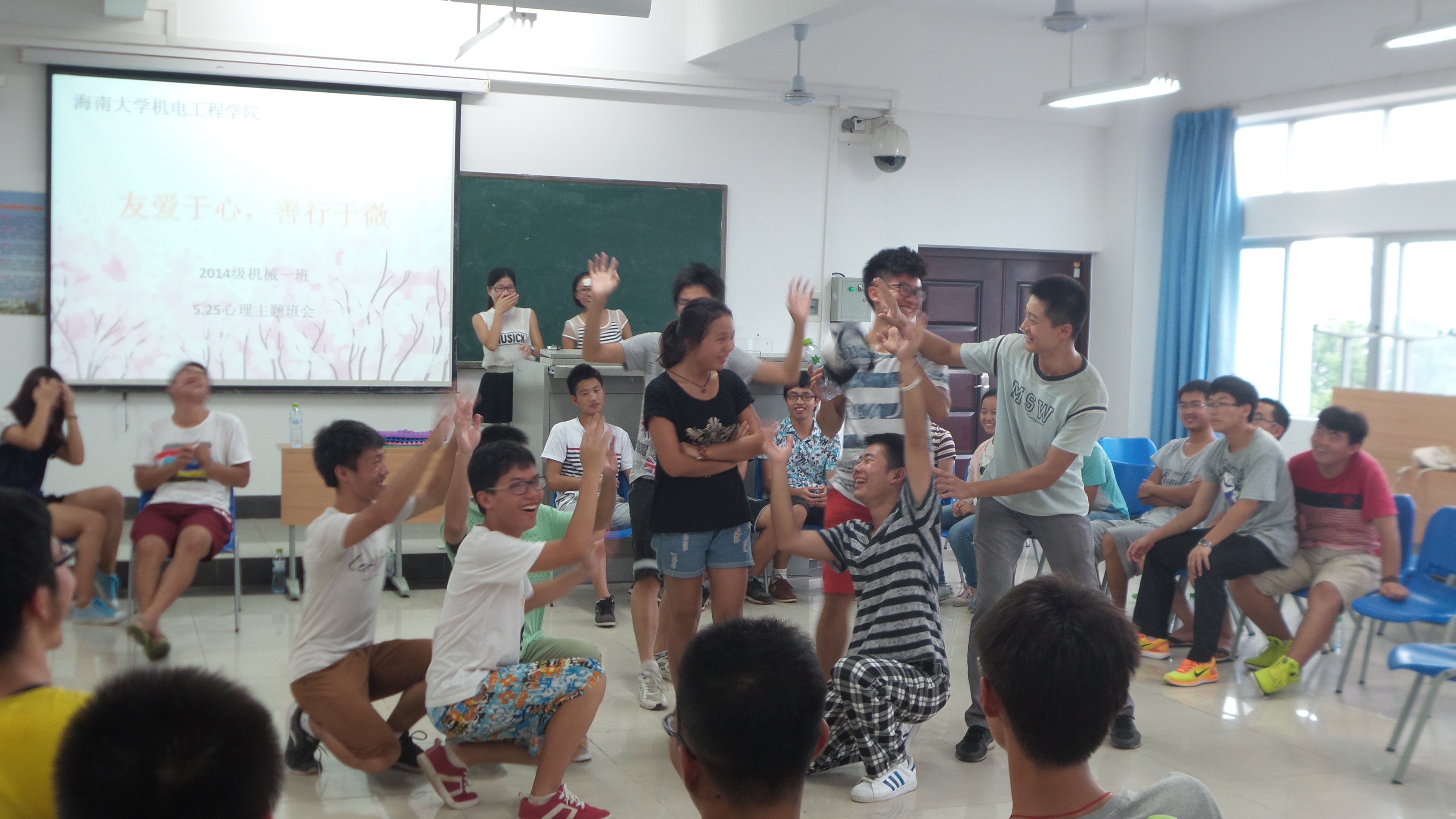 为了增强pa电子学生的心理健康意识,提高自我调适能力,促进大学生心理健康教育工作的开展。按照学校5.25心理活动月的统一安排,5月26日下午四点三十,2014级机械设计制造及其自动化1班在4教412举行了“友爱于心,善行于微”主题心理团体辅导班会。李青老师以及14级机械1班全体学生参加了此次班会。