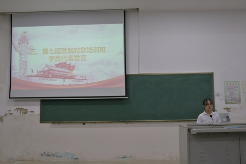 第七期发展对象培训班学员代表刘颖同学表达了自身对于加入中国共产党的向往,通过多种实践活动和学生组织任职情况,分享了在积极分子期间自身的经历与感悟,无论是心理素质还是行动能力都有着巨大的提升。她希望在本次发展对象培训班中能够学习更多党的理论知识,明确人生目标,德智体美劳全面发展。