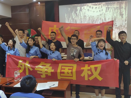 中场互动环节结束后,由机械系学生党支部带来历史情景剧《青葱岁月》,同学们动情的演绎及精心准备的服装道具深深打动了在场的观众,其实五四的火炬依然在燃烧,中国青年的爱国精神依旧在代代相传。团委学生会党支部带来的历史情景剧《共产党人是不怕死的》向我们呈现了抗日时期广大人民群众面对凄惨的社会现实,团结一致、抛头颅洒热血的爱国情怀。最后是由致远班党支部带来的相声及说唱表演《谁是歌王》,通过幽默风趣的相声表演形式既传达了新时代“五四”新青年该有的担当责任,又让现场欢声笑语不断,同时rap等时下流行元素的搭配也使得舞台形式更加丰富多彩。至此,本次风采大赛的表演画上了圆满的句号。