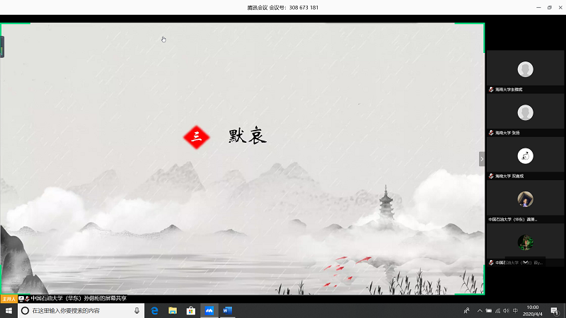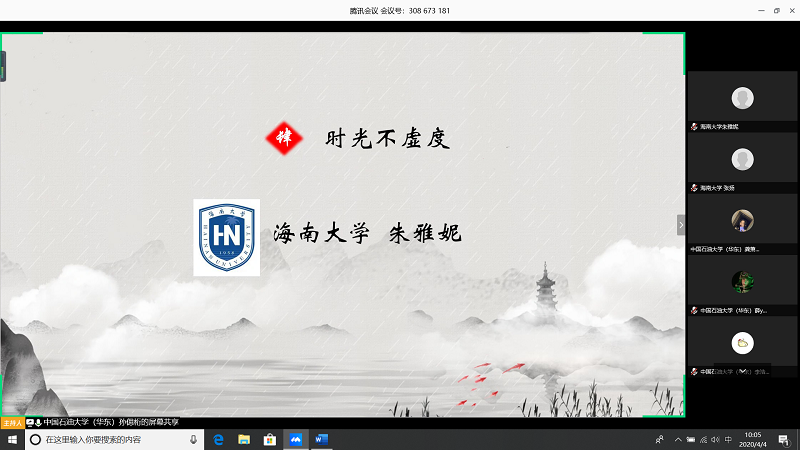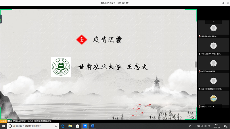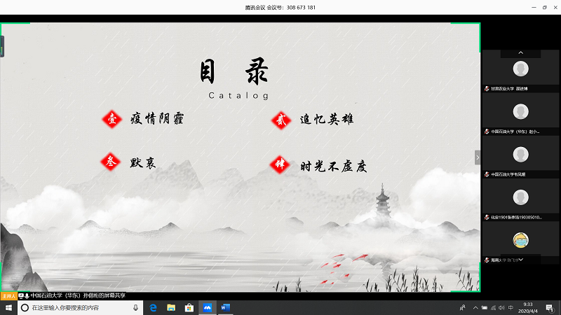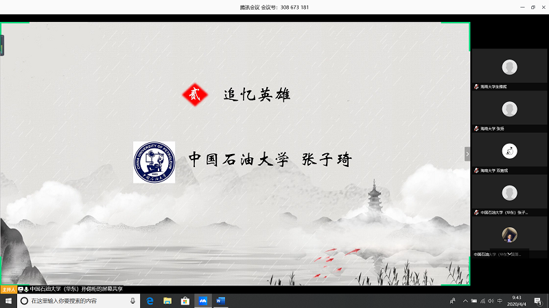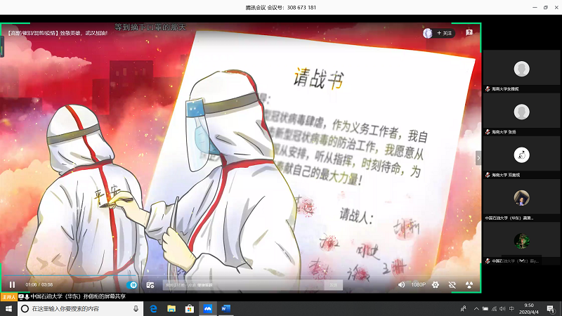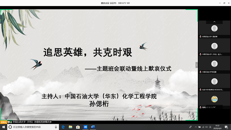 会上,由甘肃农业大学王志文同学带我们回顾疫情,虽然国内疫情已经有所缓解但是同学们还是不能放松警惕;中国石油大学(华东)张子琦同学带领大家向抗疫英雄致敬,十点开始全体起立默哀三分钟;pa电子官方网站朱雅妮为大家强调线上上课等同于课堂教学,在家学习不能懈怠,合理规划疫情期间的学习和课程安排。