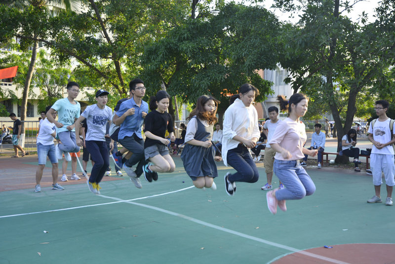 开幕式后,参加活动的各学院300余名学生在篮球场开始了“和频共振,互助向前”心理拓展活动。在“8字跳绳”比赛中,各学院学子积极参与,齐心协力,在合作中培养团队的凝聚力,在运动中疏导心情。