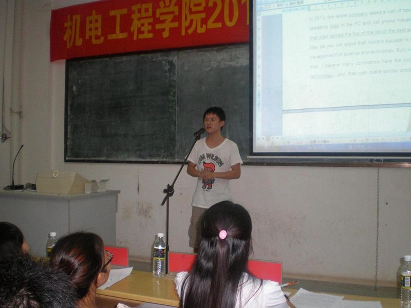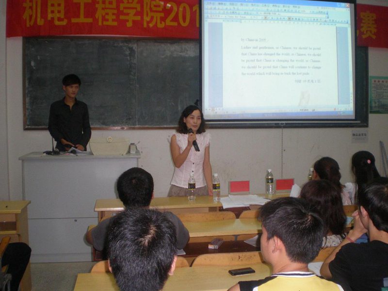 为了迎接2011年“外研社杯”全国英语演讲比赛,pa电子在9月8日(星期四)在3302课室举行院内选拔。出席此次英语演讲比赛的嘉宾有崔建兵、姚广龙老师,担当评委的有应用科技学院英语老师王菲、金晓霞,以及全国大学生英语竞赛(NECCS)获奖者马鑫。此次演讲的题目是:A Word That Has Changed the World。比赛选手由各班级推荐,共15名参赛选手,到场观众有近160名。