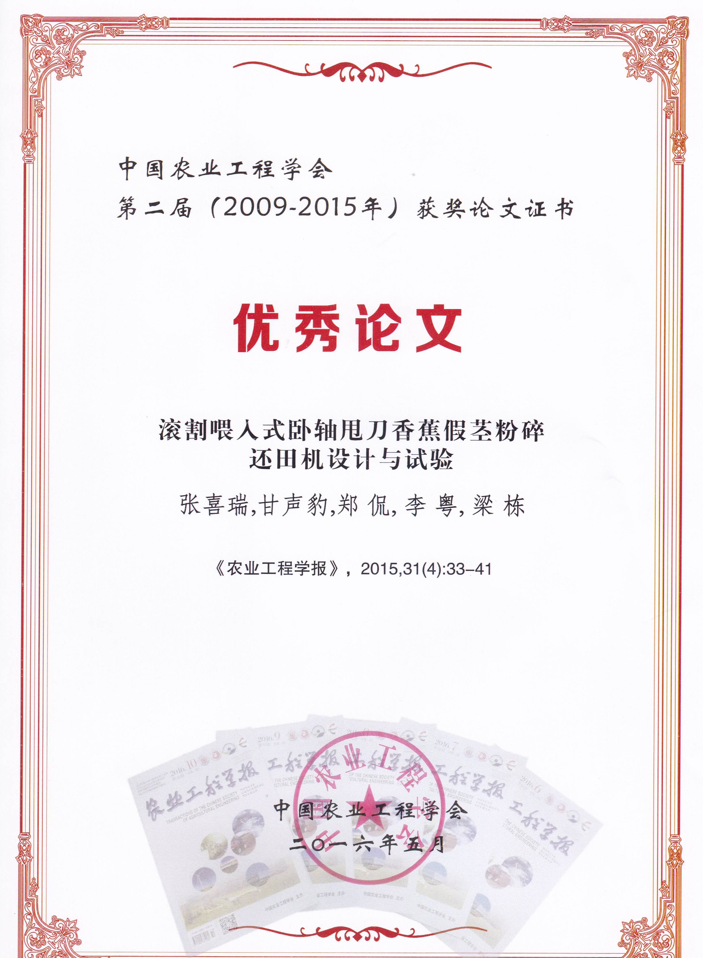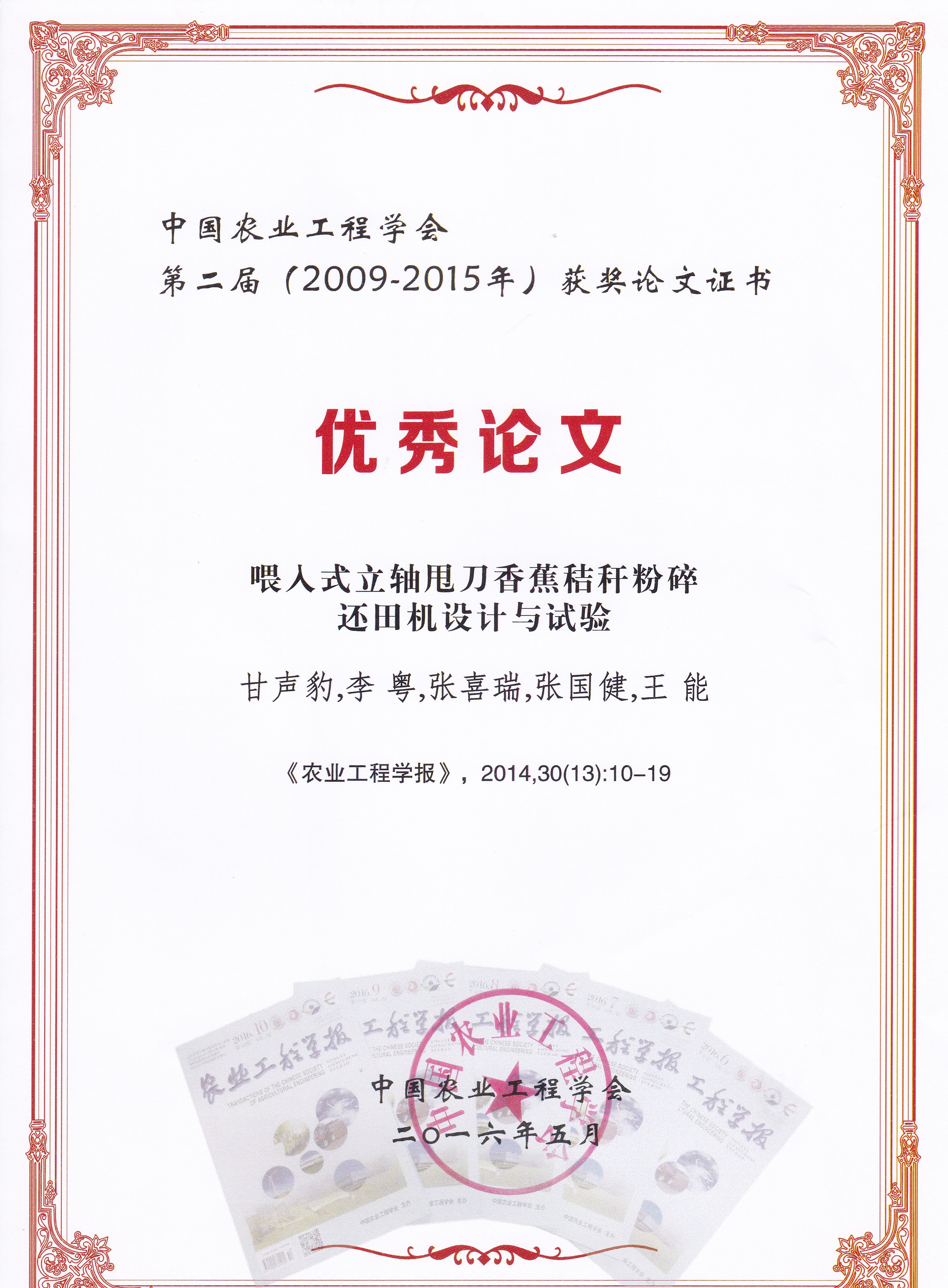 近日,pa电子热带作物秸秆机械化技术课题组两篇《农业工程学报》论文入选“中国农业工程学会第二届优秀论文”。两篇论文分别是“滚割喂入式卧轴甩刀香蕉假茎粉碎还田机设计与试验”(通讯作者:张喜瑞副教授)、“喂入式立轴甩刀香蕉秸秆粉碎还田机设计与试验”(通讯作者:李粤教授)。继2009年中国农业工程学会第一届优秀论文评选后,中国农业工程学会今年启动了第二届优秀论文评选。本届优秀论文评选范围是《农业工程学报》2009-2015年刊发的论文,优秀论文遴选采用文献指标定量与发表时专家评审意见定性相结合,提出候选论文,由中国农业工程学会组织专家评审。