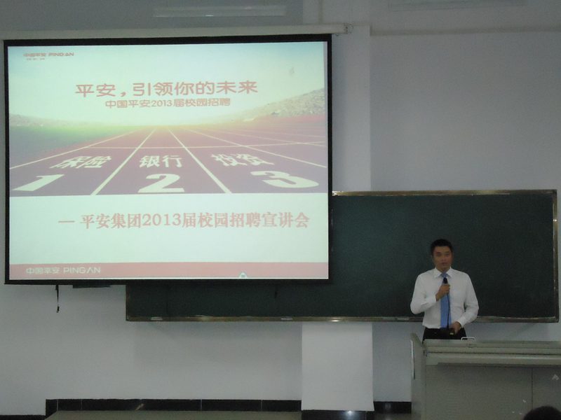 2012年10月29号晚7:30,中国平安财产保险股份有限公司面向pa电子学生的校园宣讲会在教学楼5-201举行。出席本次招聘会的有中国平安保险公司海南分公司陶炎副总经理、理赔部甄栋洽经理、理赔管理室吴直夫主任、人力资源部王晓晖经理、我校的几名优秀毕业生以及辅导员崔建兵老师。