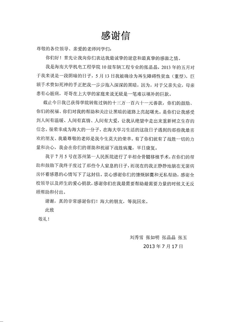 张晶晶同学,是一名活泼开朗,积极努力,品学兼优的学生,5月份被确诊为重型再生障碍性贫血,需要进行骨髓移植手术,而高昂的手术医疗费给她和她原本艰难的家庭以精神上和经济上的双重打击。海大师生向无助的张晶晶同学伸出了援手。 大爱无疆:爱心在校园内传递