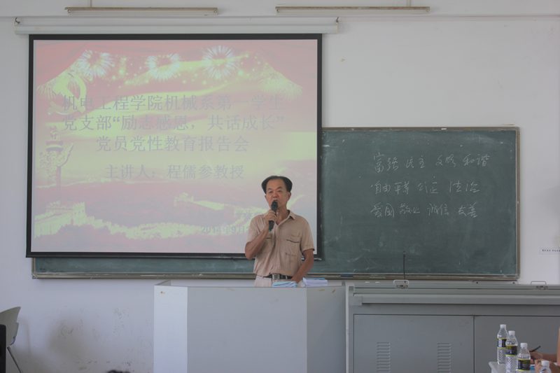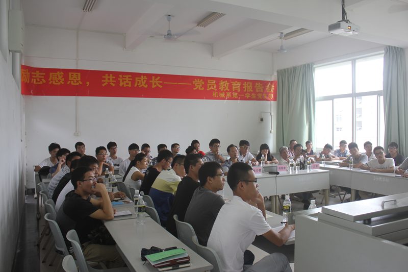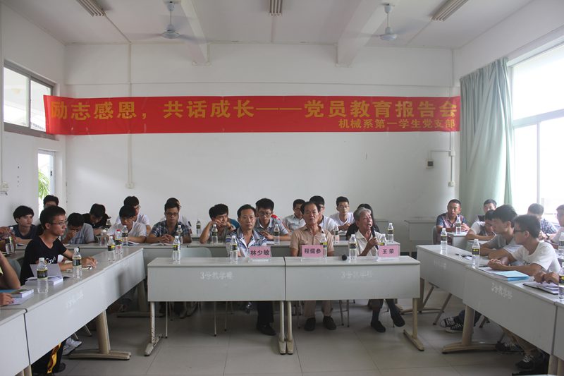 为提高党员自身意志,传播服务他人的理念,激励党员励志感恩,奋发成才,报效祖国的社会责任感,pa电子官方网站机械系第一学生党支部于2014年9月21日9:00在三教304教室召开关于“励志感恩,共话成长”党员教育报告会。出席此次报告会的领导和嘉宾有原pa电子官方网站统战部部长程儒参教授、原pa电子官方网站纪委办公室主任王荣教授、原pa电子官方网站统战部副部长林少敏教授、机械系第一学生党支部书记崔建兵老师。支部全体学生党员、预备党员,入党积极分子共计五十多人参加会议。报告由崔建兵老师主持。