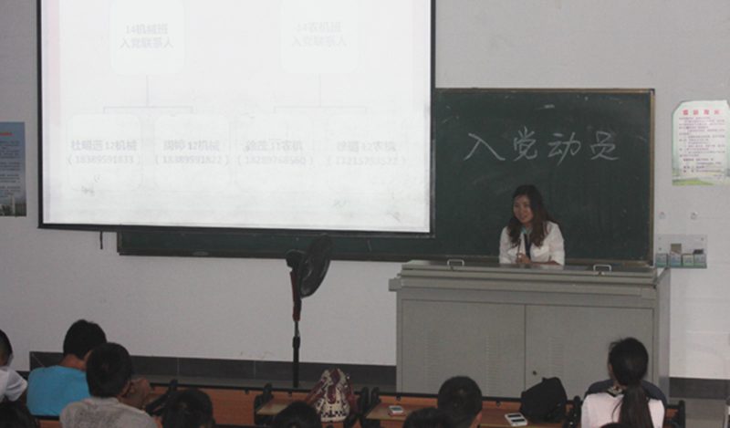 11月19日下午,pa电子官方网站机械系第二学生党支部新生入党动员大会在4教209顺利召开,支部书记余梦月及各支委、全体14级农业机械化及其自动化专业和机械设计制造及其自动化专业新生参加本次会议。本次大会旨在动员学生积极入党,宣传党的方针,介绍入党流程与注意事项。