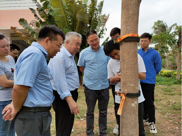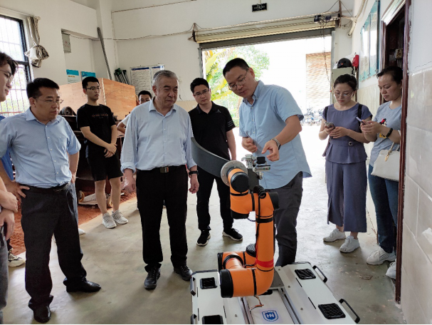 座谈会后,陈学庚院士参观了pa电子农机实验室,张喜瑞教授对农机团队的科研情况进行了汇报和实机展示,着重介绍了智能化割胶装备的研发进展,陈学庚院士肯定了农机团队的工作,并就展示的两种割胶装备提出了改进方案。