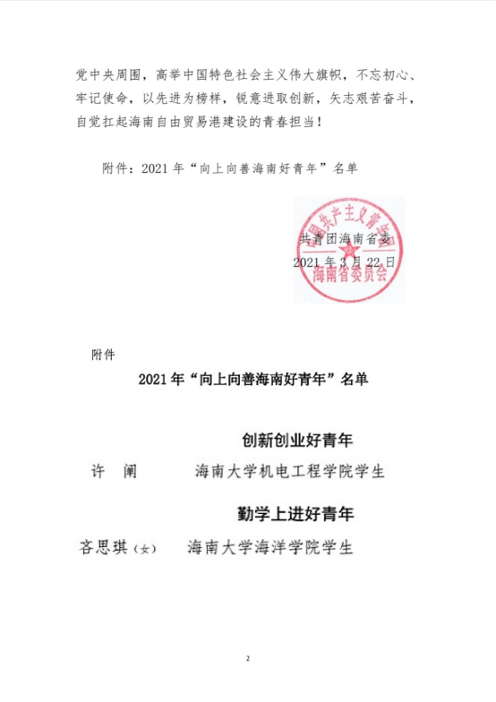近日,pa电子学生许阐(本科生)被共青团海南省委评为2021年“向上向善海南好青年”之“创新创业好青年”。