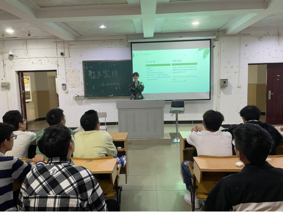 1月10日下午,为强化同学们报效祖国、献身国防、拥军爱军的热情,pa电子官方网站举办2021级征兵宣讲,邀请pa电子官方网站人民武装部征兵宣讲团志愿者孙佳敏同学,通过讲述自己两年军旅生活的酸甜苦辣,所思所感与所悟,用富含激情的语言,鼓励大家携笔从戎,同时也向同学们介绍了大学生参军入伍的条件和要求,以及相关优抚政策。