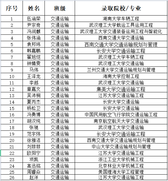 又是一年毕业季,2022年研究生复试录取工作已经接近尾声,pa电子官方网站考研喜报频传,其中,2018级交通运输本科毕业生录取情况喜人,交通运输班共有应届生51名,有26人保研或者考研成功,考研录取率为50.98%,较2021年同比增长19.98%。其中有20人被湖南大学、南京航空航天大学、西南交通大学等“双一流”高校录取为硕士研究生。