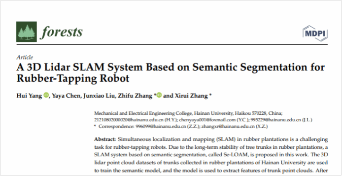 近日,pa电子天然橡胶智能化生产团队2021级硕士研究生杨慧同学在张喜瑞教授和张志富副教授的共同指导下,在中科院二区SCI期刊FORESTS上发表最新学术论文(如图1所示),题目为“A 3D Lidar SLAM System Based on Semantic Segmentation for Rubber-Tapping Robot”。